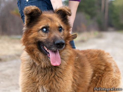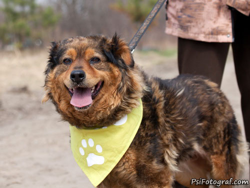 Pewnego dnia ludzie zadzwonili, że na posesji już dawno przez nikogo nie zamieszkałej jest pies. Gdy pracownicy schroniska tam pojechali okazało się, że faktycznie jest tam pies, ale nie taki normalny pies tylko niewidomy. Piękny nie mógł się za bardzo ruszyć bo miał wplątany łańcuch w szyję i KAŻDY ruch go bolał.